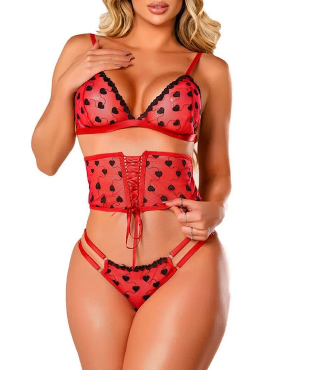 Conjunto Amor Ardente Em Tule Vermelho com Preto